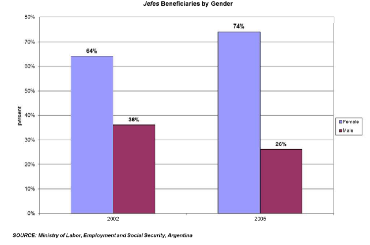 [5] Bien que les femmes représentaient environ 74 % des participants au programme Jefes en 2005, seulement 34 % de tous les participants qui ont trouvé un emploi dans le secteur privé après leur inscription au programme étaient des femmes (MTEySS 2005).