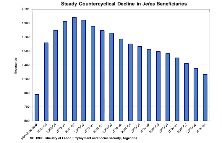de fonctionnement du programme), la baisse du taux de pauvreté fut très faible. Cela s’explique en grande partie par le fait que le salaire de Jefes lui-même était inférieur au seuil de pauvreté. Néanmoins, la pauvreté elle-même est un problème multidimensionnel, et il semble que le programme ait néanmoins amélioré la vie des pauvres de façon assez significative (voir la section suivante).