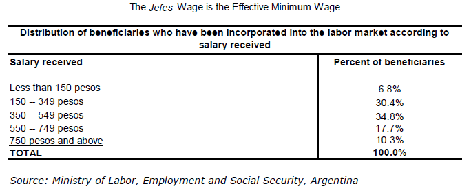Plusieurs évaluations du programme effectuées par le ministère du Travail (MTEySS 2002, 2003, 2005) et la Banque mondiale (2002, 2003) ont donné des résultats extrêmement positifs. Ce qui est intéressant ici, c’est de savoir si le Plan Jefes s’est comporté de la manière que le proposent les défenseurs de l’EDR.