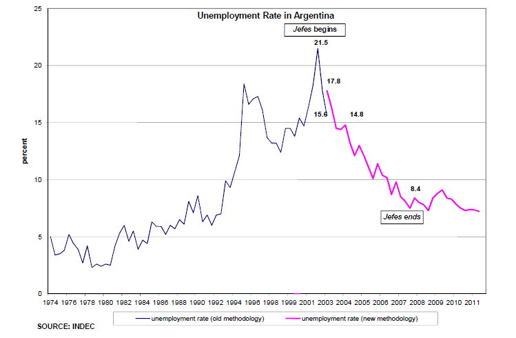 En l’espace de deux jours, les protestations ont contraint le ministre de l’économie Cavallo et le président De la Rua à quitter le pouvoir. Le premier président par intérim, Adolfo Rodríguez Saá, qui ne resta en fonction qu’une semaine, signa un important décret présidentiel établissant un programme de création d’emplois pour les chefs de familles sans emploi appelé Plan Jefes de Hogar. La proposition avait été faite par une équipe d’économistes du ministère du Travail, sur le modèle des propositions d’EDR élaborées aux États-Unis (Kostzer, 2008). Le président suivant, Eduardo Duhale, signa le décret d’urgence pour l’établissement du Plan Jefes dans la loi. Il devint le principal programme pour faire face à la dislocation sociale à la suite de l’effondrement de la caisse d’émission.