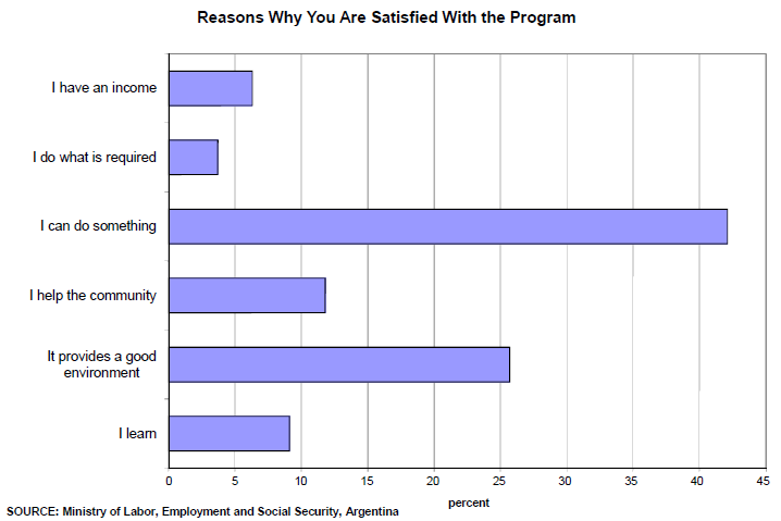Les sondages officiels auprès des participants au programme indiquent que le fait d’avoir un revenu n’est pas l’une des principales raisons de leur satisfaction à l’égard du plan Jefes. Les bénéficiaires aiment participer au programme parce qu’ils ont l’occasion de » faire quelque chose « , de travailler dans un » bon environnement « , d' » aider la communauté » et d' » apprendre » (figure 1).