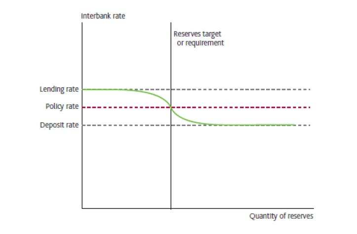 Compte tenu de la forme de la courbe de la demande, la banque centrale peut ajuster le montant agrégé des réserves à l’aide d’opérations d’open market afin d’atteindre son taux cible. Le taux de prêt est le taux auquel les banques peuvent emprunter des réserves à la banque centrale (fenêtre d’escompte) et le taux de dépôt est le taux payé sur les réserves déposées auprès de la banque centrale – appelées «facilités permanentes» par la Banque d’Angleterre. Le taux directeur se situe entre le taux de dépôt (le cas échéant) et le taux de prêt et ces deux taux administrés, le taux de prêt et le taux de dépôt (le cas échéant) donnent un plafond et un plancher au taux au jour le jour et limitent l’écart potentiel du taux au jour le jour par rapport au taux directeur. Il existe des variations internationales dans la mise en œuvre exacte des systèmes de couloirs, mais le principe derrière la politique reste le même.