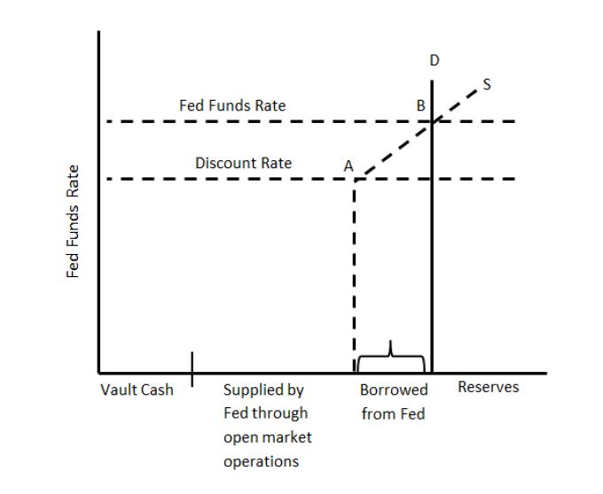 Mosler (2012) développe «une macro-analyse à l’échelle du système dans le« monde réel »» (Mosler et Armstrong, 2019, p. 11) [7] qui diffère méthodologiquement du modèle de corridor «standard». Mosler (2012) note que les réserves bancaires peuvent prendre la forme de réserves en cash, être fournies par les opérations d’open market de la Fed ou empruntées à la Fed. Si les banques sont laissées collectivement à court de réserves par les opérations d’open market de la Fed, elles doivent accéder aux réserves requises à partir de la fenêtre d’escompte. L’analyse de Mosler (2012) reconnaît les coûts administratifs et la stigmatisation éventuelle attachée à l’emprunt auprès de la fenêtre d’escompte (car elle peut être associée à une faiblesse financière). Dans ce cas, le taux des fonds fédéraux pourrait bien dépasser le taux de prêt ou d’actualisation. Cependant, à mesure que les banques font collectivement grimper le taux des fonds fédéraux, l’écart entre le taux des fonds fédéraux et le taux d’actualisation s’élargit et, à terme, les banques doivent emprunter auprès de la banque centrale. Ceci est illustré sur le schéma ci-dessous; lorsque le taux du marché dépasse le taux d’actualisation (au-delà du point A), les banques demandent des réserves à la fenêtre d’escompte. La Fed agit passivement et l’offre s’ajuste à la demande, satisfaisant finalement toute la demande (à l’équilibre du marché indiqué au point B) – un taux supérieur au taux d’actualisation. En fin de compte, cependant, la dépendance des banques à l’égard de la fenêtre d’escompte est toujours sous le contrôle de la Fed. La mise à disposition par la Fed de réserves supplémentaires via des opérations d’open market réduira le besoin des banques d’emprunter auprès de la fenêtre d’escompte. À l’inverse, si la Fed fournit moins de réserves au moyen d’opérations d’open market, l’écart entre le taux des fonds fédéraux et le taux d’actualisation s’élargira, obligeant les banques à recourir davantage aux emprunts sur la fenêtre d’escompte.