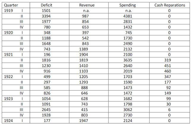 Alors que les prix de gros étaient 17 fois plus élevés en février 1920 qu’en 1913 (Hetzel 2002 : 4), le niveau des prix était relativement stable après mars 1920, et Hetzel affirme que les réformes fiscales introduites par Matthias Erzberger (ministre des finances), en supposant le niveau annuel actuel des réparations de 2,24 milliards de marks, auraient pu permettre d’équilibrer le budget : Étant donné la stabilité des dépenses réelles, la croissance de l’économie aurait augmenté les recettes et équilibré le budget » (Hetzel 2002 : 5). Toutefois, étant donné l’importance des paiements de taux d’intérêt dans l’accroissement des déficits, nous estimons que cette prédiction positive présuppose la mise en œuvre et le maintien d’un taux d’intérêt directeur bas.