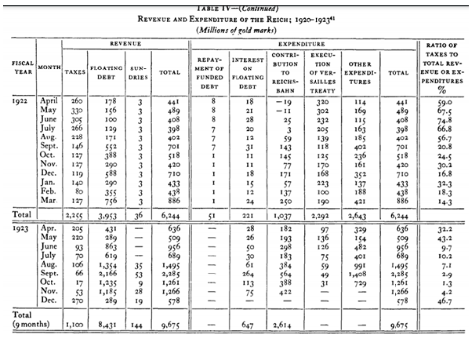 Sources [primaires] : Puissances alliées, Commission des réparations, Deutschlands Wirtschaft, Wahrung und Finanzen (Berlin, 1924), pp. 29, 62 ; Statistisches Reichsamt, Zahlen zur Geldentwertunq in Deutschland 1914 bis 1923, Sonderhefte 1 zu Wirtschaft und Statistik (Berlin, 1925), pp. 45-51 ; Wirtschaft und Statistik, 1-4 (1921-1924), passim ; Armd Jessen, Finanzen, Defizit und Notenpresse 1914-1922 (Berlin, 1923), Tableau 6 ; Bundesarchiv, Koblenz [BAK] Reichsfinanzministerium R2/2659, R2/2795;BAK, Reichskanzlei R431/2357 ; Zentrales Staatsarchiv, Potsdam [ZSa] Reichsschatzministerium 22.01/3488. Pour plus de détails, voir Webb, « Revenue and Spending ». »