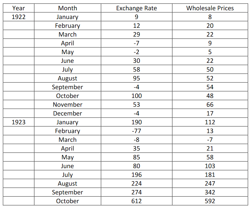 les prix ont baissé avec une amélioration du taux de change[8]. La baisse a été la plus marquée dans les prix des produits importés, qui avaient auparavant suivi directement et complètement la hausse des échanges d’or. La baisse des prix des produits nationaux fut moins marquée, car ceux-ci ne s’étaient pas adaptés dans la même mesure aux taux de change plus élevés. Pourtant, alors que les taux et les prix baissaient, l’émission de billets tripla au cours de ces dix semaines [de la fin janvier à avril 1923] » (Helfferich 1969 [1927] : 602, parenthèses ajoutées).