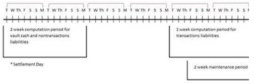 Avant 1968, les banques étaient tenues de constituer des réserves obligatoires d’une manière contemporaine : les réserves d’une semaine devaient être égales au pourcentage requis pour cette semaine. Les banques estimaient le montant moyen de leurs dépôts pour la semaine et appliquaient le ratio de réserves obligatoires approprié pour déterminer leurs réserves obligatoires. La constitution de réserves obligatoires était une obligation que chaque banque était légalement tenue de respecter. Les réserves et les dépôts bancaires, bien évidemment, évoluent continuellement au fur et à mesure que les fonds sont déposés et retirés, ce qui compliquait la tâche du directeur de la banque pour gérer les soldes de réserve. Parce que ni les dépôts moyens d’une semaine ni le montant moyen des réserves requises ne pouvaient être connus avec certitude jusqu’à la fin de la dernière journée, c’était « comme essayer d’atteindre une cible en mouvement avec un fusil tremblant ». Par conséquent, en septembre 1968, la comptabilité de réserve décalée (CRD) remplaça la comptabilité de réserve contemporaine (CRC). Dans le cadre de la CRD, la période de constitution des réserves fut fixée à sept jours se terminant chaque mercredi (voir la figure 1). Les réserves obligatoires pour une période de constitution devinrent fondées sur la moyenne des dépôts réservables quotidiens dans la période de calcul des réserves se terminant un mercredi deux semaines plus tôt. Le montant total des réserves obligatoires pour chaque banque et pour l’ensemble du système bancaire était connu à l’avance. Les réserves réelles pouvaient varier, mais au moins l’objectif était stable.