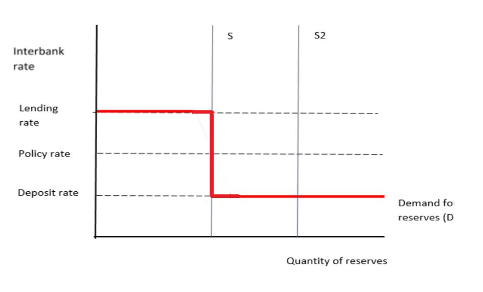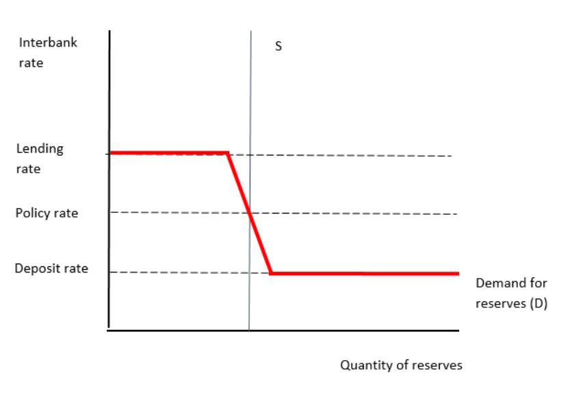 Il est alors théorisé que, compte tenu de la forme de la courbe de demande, la BC peut ajuster le montant agrégé des réserves (S) à l’aide d’opérations d’open market et ainsi atteindre son taux cible. Le taux de prêt est le taux auquel les banques peuvent emprunter des réserves à la banque centrale (fenêtre d’escompte) et le taux de dépôt est le taux payé sur les réserves déposées auprès de la BC (dénommées «facilités permanentes» par la Banque d’Angleterre 2010: 295). Le taux directeur se situe entre le taux de dépôt et le taux de prêt et ces deux taux administrés définissent un plafond et un plancher pour le taux au jour le jour et limitent la divergence potentielle du taux au jour le jour par rapport au taux directeur. Au niveau international, il existe des variations dans la mise en œuvre exacte des systèmes de couloirs, mais le principe derrière la politique reste le même.