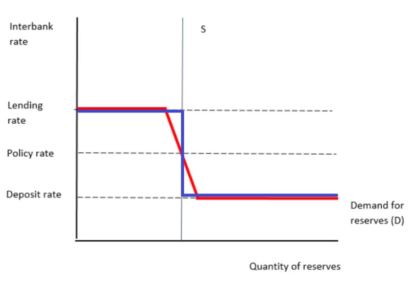 La BC utilise des opérations d’open market pour ajuster le niveau des réserves dans le système lui permettant d’atteindre son taux directeur. Le système repose sur un marché interbancaire bien organisé qui, à son tour, facilite une répartition efficace des réserves entre les banques. Bien que nous soyons d’accord avec le fonctionnement du modèle de corridor, notre récit diffère du récit standard. Premièrement, nous considérons la demande de réserves comme étant fixe à un moment donné et en fonction d’autre chose que les taux d’intérêt. Cette vue est décrite par la ligne bleue ci-dessous: