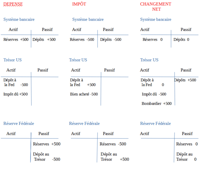 Le Trésor tire tous ses chèques de comptes à la Fed. Les fonds sont transférés des comptes d’impôts et de prêts à la Fed, puis prélevés sur le compte de la Fed pour acheter des biens et services ou effectuer des paiements de transfert. Supposons que le Trésor ait l’intention de payer 500 millions de dollars pour un bombardier furtif B-2. Le Trésor transfère 500 millions de dollars de ses comptes d’impôts et de prêts à son compte à la Fed. Les banques commerciales ont maintenant 500 millions de dollars de dépôts en moins et donc 500 millions de réserves en moins. A la Fed, les réserves diminuent de 500 millions de dollars, tandis que les dépôts du Trésor ont augmenté de 500 millions de dollars. À ce moment-là, l’augmentation des dépôts du Trésor américain réduit les réserves et la base monétaire, mais lorsque le Trésor paie pour le bombardier, le processus précédent est inversé. Les U.S. dépôts du Trésor américain à la Fed baissent de 500 millions de dollars et l’entrepreneur de la défense dépose le chèque reçu du Trésor dans sa banque, dont les réserves augmentent de 500 millions de dollars. Les dépenses publiques ne modifient pas la base monétaire quand les réserves évoluent simultanément dans des proportions égales et dans des directions opposées.