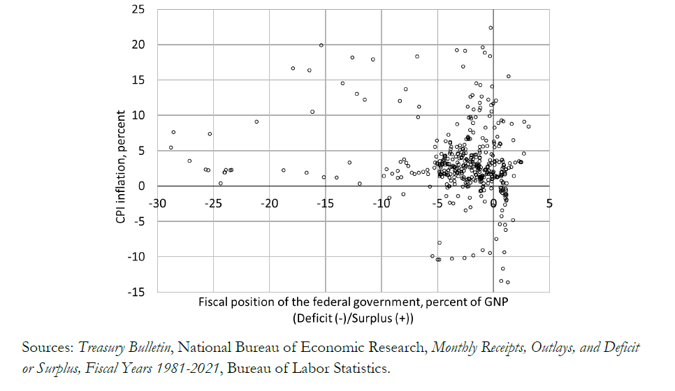 Enfin, un simple coup d’œil aux données relatives aux États-Unis montre que l’association automatique des déficits budgétaires à l’inflation n’est pas justifiée (Tymoigne 2020) (Figure 1). Les déficits budgétaires importants (comme ceux de la Seconde Guerre mondiale ou de la pandémie de COVID-19) ne sont pas associés à une inflation élevée et les déficits budgétaires réguliers inférieurs à 5 % du PIB sont associés à un large éventail de dynamiques de prix. Un déficit budgétaire peut être inflationniste, mais pas seulement parce qu’il s’agit d’un déficit ; cela dépend du degré de restriction des ressources et de l’efficacité des mesures prises pour contrôler l’inflation si l’offre de ressources se resserre. Un déficit budgétaire peut également être associé à l’inflation mais peut n’avoir rien à voir avec elle si l’inflation provient d’autres sources qu’une réduction de l’écart de production (hausse des coûts de l’énergie, hausse des taux d’intérêt, problèmes de chaîne d’approvisionnement, hausse des marges, entre autres) (Minsky 1986 ; Rowthorn 1977 ; Lavoie 2014).