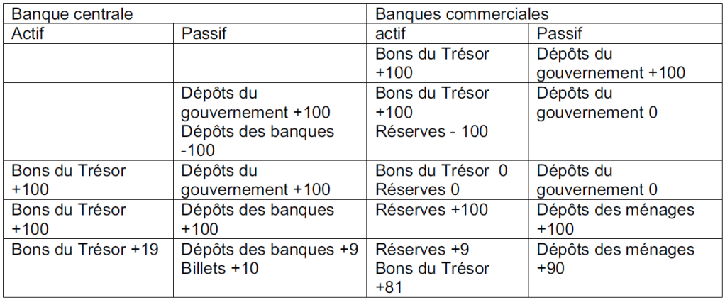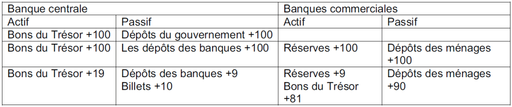 Alors que la première étape ne concerne que la vente de titres, comme c’était le cas dans le tableau 1, dans la deuxième étape, je suppose à nouveau que l’Etat paie ses fonctionnaires. Les soldes des administrations publiques dans les banques commerciales sont alors ramenés à zéro, tandis que ceux des ménages augmentent de 100, comme indiqué dans la deuxième ligne. On peut encore supposer, comme dans le tableau 1, que les ménages souhaitent transformer 10 unités de leurs dépôts sous forme de billets de banque, et que les banques sont soumises à un taux de réserve obligatoire de 10% sur les dépôts. Pour acquérir les 19 unités requises de monnaie banque centrale, les banques ont besoin de vendre 19 unités de bons du Trésor à la banque centrale. Cette dernière doit s’exécuter, puisque la banque centrale fournit toutes les espèces à la demande et doit retirer les réserves excédentaires pour atteindre son objectif de taux au jour le jour. Le résultat final de ce processus, illustré dans la troisième ligne, n’est pas différent de celui observé dans le tableau 1. Les banques commerciales détiennent 81 unités de bons du Trésor et la banque centrale détient 19 unités de bons du Trésor, qui correspondent à l’augmentation de la demande de monnaie banque centrale.