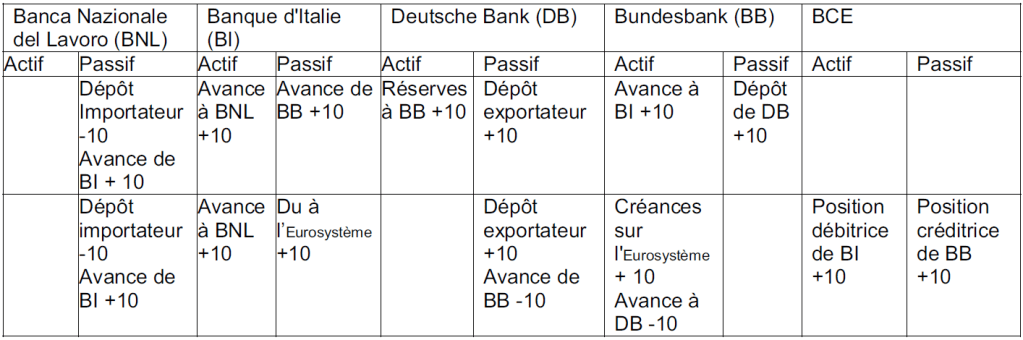 Supposons qu’une entreprise italienne importe des biens d’Allemagne et effectue son paiement par l’intermédiaire de sa banque italienne, disons la Banca Nazionale de Lavoro (BNL). Le paiement passe par TARGET2, et finit comme un crédit sur le compte de la société allemande d’exportation à sa banque allemande, disons la Deutsche Bank (DB). A ce stade, la banque italienne est en situation débitrice à la Banque d’Italie, tandis que la banque allemande est en situation créditrice à la Bundesbank. En outre, la Bundesbank débite le compte de la Banque d’Italie. Tout cela se passe en douceur puisque les banques centrales nationales de la zone euro fournissent les unes aux autres des lignes de crédit illimitées et ne nécessitant pas d’être adossées à des actifs. Tous ces comptes de débit et de crédit sont enregistrés sur la première ligne du tableau 5. (33) Toutefois, à la fin de la journée, les banques centrales nationales doivent aussi équilibrer leurs comptes les unes avec les autres. Tous les débits et les crédits sont consolidés dans les livres de la BCE, où chaque banque centrale nationale acquiert alors une position nette vis-à-vis du reste du Système européen de banques centrales (SEBC). Ceci est illustré sur la deuxième ligne du tableau 5. En outre, très probablement, la Deutsche Bank va utiliser son solde de compensation positif (ou réserves) afin de réduire sa position de découvert vis-à-vis de la Bundesbank (34).