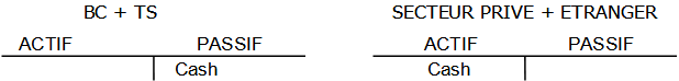 Le cash est un passif dans le bilan du secteur public (BC plus TS) qui l’émet, et un actif dans le bilan consolidé d’un grand secteur « d’utilisateurs » de cash qui comprend le secteur privé (ménages, entreprises et banques résidentes) et le secteur étranger. À titre d’illustration, nous considérons ici le bilan du secteur public qui émet les billets de banque et les pièces (c’est-à-dire enregistré au passif) et le bilan consolidé du secteur privé et du secteur étranger qui possède les espèces (c’est-à-dire enregistré à l’actif).