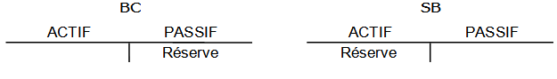 La liquidité bancaire (ou réserve) est un passif de la banque centrale émettrice, et constitue un actif dans le bilan des banques sous la forme d’un solde créditeur sur un compte spécial auprès de la BC. À titre d’illustration, nous considérons ici le bilan de la banque centrale (BC) qui émet la liquidité bancaire (c’est-à-dire comptabilisée au passif), et le bilan consolidé du secteur bancaire (SB) qui l’utilise (et où les réserves sont comptabilisées à l’actif).