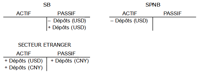 Dans ce cas également, le stock total des dépôts auprès du SB (des États-Unis) n’est donc pas modifié, puisqu’il s’agit d’un paiement entre l’importateur et l’exportateur régi par le crédit d’un « tiers », c’est-à-dire le SB du pays importateur. Ce qui est changé, c’est la disponibilité de la monnaie des banques : d’un résident américain à un résident chinois (après importation), puis à un résident américain (au cas où ce dernier vendrait des devises étrangères pour récupérer des dollars).