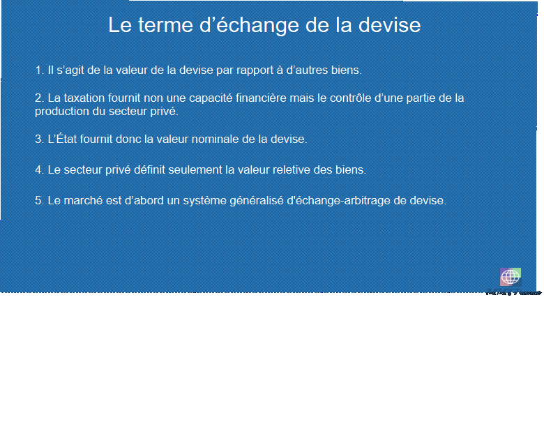 Il en découle que, contrairement à ce que certains avancent, le terme d’échange de la devise, qui peut donc être considéré, d’une manière générique, comme la valeur de la devise par rapport à d’autres biens, est une fonction des prix payés par l’État, sans aucun lien avec la quantité de devise, et donc sans aucun lien avec le déficit budgétaire. Et, lorsqu’il s’exprime vis-à-vis de l’extérieur, donc en termes de taux de change par rapport aux autres devises, il le fait a priori, donc sans relation, avec le solde commercial.